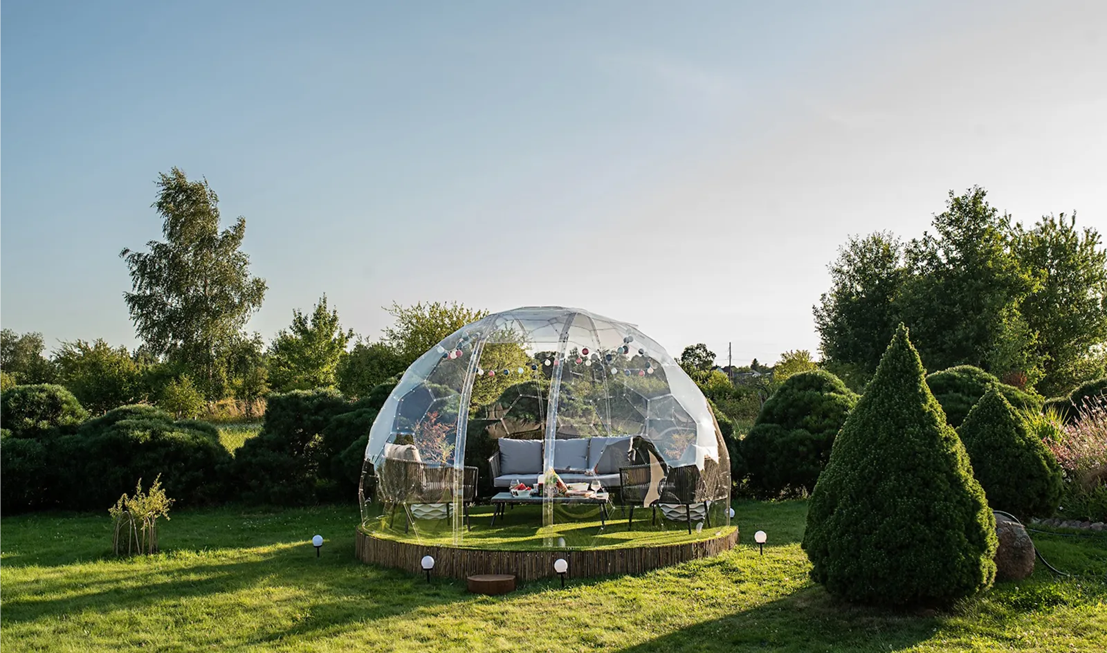 Turned our garden into a proper outdoor lounge with comfy seating inside the dome. Sheltered from the wind and rain, we use it almost every evening. Perfect for unwinding with a glass of wine after work.